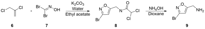 Varasi’s synthesis is notable for its inexpensive starting materials and mild conditions. It begins with the combination of 2,3-Dichloro-1-propene (6), potassium bicarbonate, water, and dibromoformaldoxime (7), all dissolved in ethyl acetate. 5-Chloromethyl-3-bromoisoxazole (8) was extracted with an experimental yield of 81%. 5-Aminomethyl-3-bromoisoxazole (9) was formed in 90% yield by the combination of (8) and ammonium hydroxide in dioxane.[33]