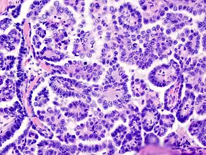 | Medium power slide of ovarian serous adenocarcinoma stained using haematoxylin and eosin. | |