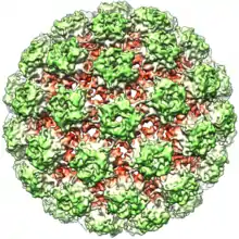 The viral capsid consists of 72 capsomeres of which 12 are five-coordinated and 60 are six-coordinated capsomeres, arranged on a T = 7d icosahedral surface lattice.[32]