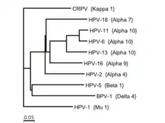 Phylogenetic studies strongly suggest that PVs normally evolve together with their mammalian and bird host species, but adaptive radiations, occasional zoonotic events and recombinations may also impact their diversification.[13] Their basic genomic organization appears maintained for a period exceeding 100 million years, and these sequence comparisons have laid the foundation for a PV taxonomy, which is now officially recognized by the International Committee on Taxonomy of Viruses. All PVs form the family Papillomaviridae, which is distinct from the Polyomaviridae thus eliminating the term Papovaviridae. Major branches of the phylogenetic tree of PVs are considered genera, which are identified by Greek letters. Minor branches are considered species and unite PV types that are genomically distinct without exhibiting known biological differences. This new taxonomic system does not affect the traditional identification and characterization of PV "types" and their independent isolates with minor genomic differences, referred to as "subtypes" and "variants", all of which are taxa below the level of "species".[14] Additionally, phylogenetic groupings at higher taxonomic level have been proposed.[15]