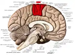 ![]() Medial surface of left cerebral hemisphere. (Paracentral lobule is shown in red.) | |