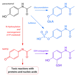 When taken in normal therapeutic doses, paracetamol has been shown to be safe.[13] Following a therapeutic dose, it is mostly converted to nontoxic metabolites via Phase II metabolism by conjugation with sulfate and glucuronide, with a small portion being oxidized via the cytochrome P450 enzyme system.[34] Cytochromes P450 2E1 and 3A4 convert approximately 5% of paracetamol to a highly reactive intermediary metabolite, N-acetyl-p-benzoquinone imine (NAPQI).[34][13][35][36][37] Under normal conditions, NAPQI is detoxified by conjugation with glutathione to form cysteine and mercapturic acid conjugates.[34][38]