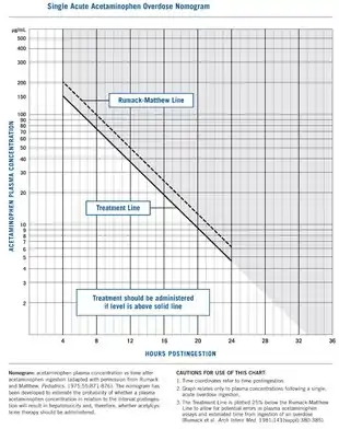 A person's history of taking paracetamol is somewhat accurate for the diagnosis.[40] The most effective way to diagnose poisoning is by obtaining a blood paracetamol level. A drug nomogram developed in 1975, called the Rumack-Matthew nomogram, estimates the risk of toxicity based on the serum concentration of paracetamol at a given number of hours after ingestion.[10] To determine the risk of potential hepatotoxicity, the paracetamol level is traced along the nomogram. Use of a timed serum paracetamol level plotted on the nomogram appears to be the best marker indicating the potential for liver injury.[19] A paracetamol level drawn in the first four hours after ingestion may underestimate the amount in the system because paracetamol may still be in the process of being absorbed from the gastrointestinal tract. Therefore, a serum level taken before 4 hours is not recommended.[18]