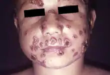 The juvenile, acute form is characterised by symptoms, such as fever, weight loss and feeling unwell together with enlarged lymph nodes and enlargement of the liver and spleen.[10][11][12] This form is most often disseminated, with symptoms manifesting depending on the organs involved.[10] Skin and mucous membrane lesions are often present,[13] and bone involvement may occur in severe cases.[10] This acute, severe presentation may mimic tuberculosis, lymphoma or leukaemia.[13]