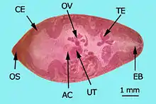 Species of Paragonimus vary in size; the adult stage might attain a length of up to 15 millimetres (0.59 in) and a width of up to 8 mm (0.31 in).[5] The adult flatworm has an oval shape body with spines covering its thick tegument. Both the oral sucker and acetabulum are round and muscular. The acetabulum is slightly bigger than the oral sucker – 0.19 mm and 0.12 mm, respectively.[5] Ovaries are located behind the acetabulum and posterior to the ovary are the testes. The seminal receptacle, the uterus and its metraterm, the thick-walled terminal part, lie between the acetabulum and the ovary.[5]