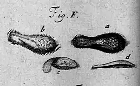 Paramecia were among the first ciliates to be seen by microscopists, in the late 17th century. They were probably known to the Dutch pioneer of protozoology, Antonie van Leeuwenhoek, and were clearly described by his contemporary Christiaan Huygens in a letter of 1678.[3] The earliest known illustration of a Paramecium was published anonymously in Philosophical Transactions of the Royal Society, in 1703.[4]