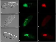 P. caryophila are parasitic inside the nucleus of P. biaurelia. As with other species of Holospora, they rely on the protist for amino acids, energy metabolic pathways including glycolysis and the citric acid cycle, as well as for nucleotides.[14] In contrast, Bealeia paramacronuclearis and Fokinia cryptica are cytoplasmic parasites. Bealeia paramacronuclearis are spherical or oval shaped measuring about 1.8 to 2.4 μm long and 0.4 to 0.5 μm broad. Inside the protist, they are arranged in clusters of about 7 to 8 cells in parallel lines. They mostly lie close to the macronucleus (the reason for the species name) and sometimes appear attached to the nuclear envelope. Fokinia cryptica are smaller with the diameter 0.35 to 0.40 μm. They are more randomly distributed in the cytoplasm.[4]