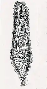 Paramecium caudatum is 170–330 micrometres long (usually 200–300 micrometres).[6] The cell body is spindle-shaped, rounded at the front, tapering at the posterior to a blunt point. Early microscopists likened its shape to that of a slipper, and commonly referred to it as the "slipper animalcule."[7] The pellicle is uniformly covered with cilia, and has a long oral groove, leading to deeply embedded oral cavity, lined with cilia (short, hair-like protoplasmic processes that serve as organs of locomotion and food capture). P. caudatum has two contractile vacuoles, which serve to excrete excess water taken up from the outside, regulating the water contents of the body. Radially distributed "collecting canals" give the contractile vacuoles a distinctive star-like shape.[8][7] The cell is enclosed by a cellular envelope (cortex) densely studded with spindle-shaped extrusomes called trichocysts.[4][5]