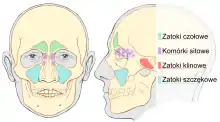 Sometimes, people with nasal cavity or paranasal sinus cancer do not show any of these symptoms. In fact, these types of cancer are usually diagnosed in their later stages because early-stage cancer typically does not cause any symptoms. Nasal cavity or paranasal sinus cancer is often discovered when a person is being treated for seemingly benign, inflammatory disease of the sinuses, such as sinusitis.[4] The signs and symptoms are generally caused by the neighbour structures like the paranasal sinus and nasal cavity.[5] There are no obvious signs and symptoms before the invasion of the tumor into bony area occurred. During the progress of the cancer, the overall signs and symptoms could be sinus pressure and blocked sinus, sinus areas pain and headaches, Nosebleeds, ear pressure and pain, etc.[1] Different symptoms will start to appear as the tumor start to invade into other body structures. symptoms such as proptosis, diplopia and other visual lesions would appear when tumor invade into the orbit.[5] Symptoms such as trismus (lockjaw), facial swelling, toothache, mid-face or jaw numbness would occur as the tumor invades the infratemporal fossa, pterygopalatine fossae or masseteric space.[5] Invasion to the cranial cavity may lead to headaches, nerve damage, and cerebrospinal fluid leak.