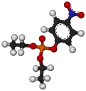 Paraoxon is a parasympathomimetic which acts as an cholinesterase inhibitor. It is an organophosphate oxon, and the active metabolite of the insecticide parathion. It is also used as an ophthalmological drug against glaucoma. Paraoxon is one of the most potent acetylcholinesterase-inhibiting insecticides available, around 70% as potent as the nerve agent sarin, and so is now rarely used as an insecticide due to the risk of poisoning to humans and other animals. Paraoxon has been used by scientists to study acute and chronic effects of organophosphate intoxication.[1][2] It is easily absorbed through skin, and was allegedly used as an assassination weapon by the apartheid-era South African chemical weapons program Project Coast.[3]
