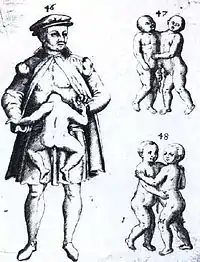 Illustration of a man with a parasitic twin, alongside illustrations of two configurations of conjoined twins