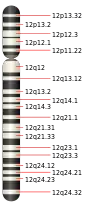 Parastremmatic dwarfism is caused by a missense mutation (where one amino acid is replaced by another in a gene sequence) in the TRPV4 gene,[4] located on the long arm of human chromosome 12, at 12q24.11.[5] The mutation is in exon 11 of the gene, and is labelled R594H; this means that the codon (the code for an amino acid molecule) for arginine was erroneously substituted by a codon for histidine at position 594 in that exon. This same mutation in the TRVP4 gene is known to cause the Kozlowski type of spondylometaphyseal dysplasia.[4][6]