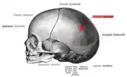 ![]() Skull of a new-born child from the side. (Parietal eminence shown in red.) | |