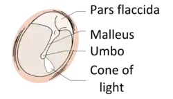 In human anatomy, the pars flaccida of tympanic membrane or Shrapnell's membrane (also known as Rivinus' ligament) is the small, triangular, flaccid portion of the tympanic membrane, or eardrum. It lies above the malleolar folds attached directly to the petrous bone at the notch of Rivinus. On the inner surface of the tympanic membrane, the chorda tympani crosses this area.
