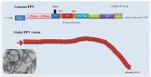 | Genome of plum pox virus of genus Potyvirus with tansmission electron micrograph and model of virions | |