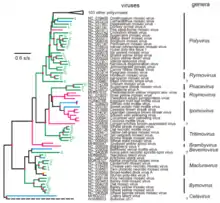 Potyvirus is the largest genus in the family, with 183 known species.[7] These viruses are 720–850 nm in length and are transmitted by aphids. They can also be easily transmitted by mechanical means. These viruses shared a common ancestry 6,600 years ago[8] and are transmitted by over 200 species of aphids.