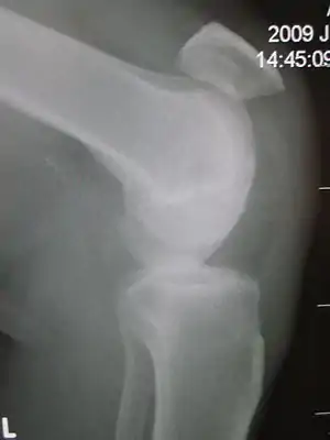 | Patellar tendon rupture showing a marked distance between the tibial tuberosity and the bottom of the knee cap. | |