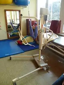 A patient lift (patient hoist, jack hoist, hydraulic lift) may be either a sling lift or a sit-to-stand lift. This is an assistive device that allows patients in hospitals and nursing homes and people receiving home health care to be transferred between a bed and a chair or other similar resting places, by the use of electrical or hydraulic power. Sling lifts are used for patients whose mobility is limited. Sling lifts are mobile (or floor) lifts or overhead lifts (ceiling- or wall-mounted, or using overhead tracks).[1][2]