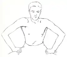The pectoralis major has four actions which are primarily responsible for movement of the shoulder joint.[7] The first action is flexion of the humerus, as in throwing a ball underhand, and in lifting a child. Secondly, it adducts the humerus, as when flapping the arms. Thirdly, it rotates the humerus medially, as occurs when arm-wrestling. Fourthly the pectoralis major is also responsible for keeping the arm attached to the trunk of the body.[7][8] It has two different parts which are responsible for different actions. The clavicular part is close to the deltoid muscle and contributes to flexion, horizontal adduction, and inward rotation of the humerus. When at an approximately 110 degree angle, it contributes to adduction of the humerus. The sternocostal part is antagonistic to the clavicular part contributing to downward and forward movement of the arm and inward rotation when accompanied by adduction. The sternal fibers can also contribute to extension, but not beyond anatomical position.[9]