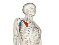 ![]() Pectoralis minor muscle (shown in red). The bone shown in blue is the shoulder blade. | |
