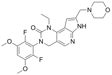 Pemigatinib (INN),[2] sold under the brand name Pemazyre, is a medication for the treatment of adults with previously treated, unresectable locally advanced or metastatic bile duct cancer (cholangiocarcinoma) with a fibroblast growth factor receptor 2 (FGFR2) fusion or other rearrangement as detected by an FDA-approved test.[3][4] Pemigatinib works by blocking FGFR2 in tumor cells to prevent them from growing and spreading.[3]