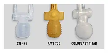 The first modern prosthetic reconstruction of a penis is attributed to NA Borgus, a German physician who performed the first surgical attempts in 1936 on soldiers with traumatic amputations of the penis. He used rib cartilages as prosthetic material and reconstructed the genitals for both micturition and intercourse purposes.[2] Willard E. Goodwin and William Wallace Scott were the first to describe the placement of synthetic penile implants using acrylic prosthesis in 1952.[3] Silicone-based penile implants were developed by Harvey Lash and the first case series were published in 1964.[4] The development of a high-grade silicone that is currently used in penile implants is credited to NASA.[5] The prototypes of the contemporary inflatable and malleable penile implants were presented in 1973 during the annual meeting of the American Urological Association by two groups of physicians from Baylor University (Gerald Timm, William E. Bradley and F. Brantley Scott) and University of Miami (Michael P. Small and Hernan M. Carrion).[2][6][7] Small and Carrion pioneered the popularization of semi-rigid penile implants with the introduction of Small-Carrion prosthesis (Mentor, USA) in 1975. Brantley Scott described the initial device as composed of two inflatable cylindrical bodies made up of silicone, a reservoir containing radiopaque fluid and two pumping units.[6] The first generation products were marketed through American Medical Systems (AMS; currently Boston Scientific), with which Brantley Scott was associated.[5][8] Many device updates have been released by AMS since the first generation implants. In 1983, Mentor (currently Coloplast) joined the market.[5] In 2017, there were more than ten manufacturers of penile implants in the world, however only a few now remain in the market.[9] The latest additions to the market are Zephyr Surgical Implants and Rigicon Innovative Urological Solutions.[10][11] Zephyr Surgical Implants, along with penile implants for biological men, introduced the first line of inflatable and malleable penile implants designed for sex reassignment for trans men.