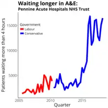 The trust was one of 26 responsible for half of the national growth in patients waiting more than four hours in accident and emergency over the 2014/2015 winter.[12]