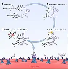 PRRT radiopharmaceuticals are constructed with three components; the radionuclide, chelator, and somatostatin analogue (peptide). The radionuclide delivers the actual therapeutic effect (or emission, such as photons, for imaging). The chelator is the essential link between the radionuclide and peptide. For 177Lu and 90Y this is typically DOTA (tetracarboxylic acid, and its variants) and DTPA (pentetic acid) for 111In.[7] Other chelators known as NOTA (triazacyclononane triacetic acid) and HYNIC (hydrazinonicotinamide) have also been experimented with, albeit more for imaging applications.[8][9] The somatostatin analogue affects biodistribution of the radionuclide, and therefore how effectively any treatment effect can be targeted. Changes affect which somatostatin receptor is most strongly targeted. For example, DOTA-lanreotide (DOTALAN) has a lower affinity for receptor 2 and a higher affinity for receptor 5 compared to DOTA-octreotide (DOTATOC).[6][10]