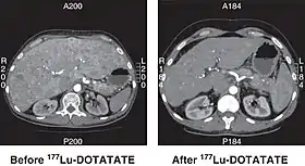 ![]() CT scan of non-functioning pancreatic NET before and 6 months after successful treatment with four cycles of 177Lu-DOTATATE. | |