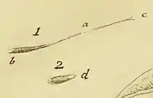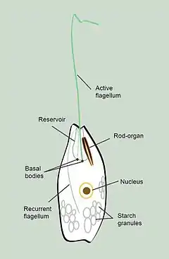At the anterior of the cell, there is a narrow aperture, opening into a flask-shaped "reservoir", from which the organism's two flagella emerge. At the bottom of this reservoir lie the basal bodies (centrioles) from which the flagella extend.[12] One flagellum is relatively long and conspicuous, and when the Peranema is gliding it is held stiffly in front. At the tip of the flagellum, a short segment beats and flails in a rhythmic manner, possibly as a mechanism for detecting and contacting potential prey. Peranama usually glides belly-down, without rotating.[13]