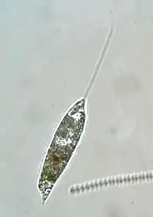 Peranema is a genus of free-living phagotrophic euglenids (Euglenida; Euglenozoa; Excavata). There are more than 20 nominal species, varying in size between 8 and 200 micrometers.[1] Peranema cells are gliding flagellates found in freshwater lakes, ponds and ditches, and are often abundant at the bottom of stagnant pools rich in decaying organic material.[2] Although they belong to the class Euglenoidea, and are morphologically similar to the green Euglena, Peranema have no chloroplasts, and do not conduct autotrophy. Instead, they capture live prey, such as yeast, bacteria and other flagellates, consuming them with the help of a rigid feeding apparatus called a "rod-organ." Unlike the green euglenids, they lack both an eyespot (stigma), and the paraflagellar body (photoreceptor) that is normally coupled with that organelle.[3] However, while Peranema lack a localized photoreceptor, they do possess the light-sensitive protein rhodopsin, and respond to changes in light with a characteristic "curling behaviour."[4]