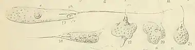 The earliest record of a Peranema is in O.F. Müller's Animalcula Infusoria of 1786, which describes an "elongated linear" creature, "stretched out at the front." Müller named it Vibrio strictus, placing it among the "long-necked" infusoria, along with Lacrymaria olor and Dileptus.[5] The species Peranema trichophorum was seen and described in 1838 by C.G. Ehrenberg, who, like Müller before him, took the flagellum for a necklike extension of the body, and placed it in the ciliate genus Trachelius.[6] Peranema was correctly identified as a flagellate by Félix Dujardin, who created the genus in 1842, giving it the name Pyronema, for its pyriform (pear-shaped) body. However, because that name had already been applied to a genus of fungi, he amended the genus to Peranema, formed from the Greek πέρα (a leather purse or sack) and νήμα (a thread).[7] Unfortunately, this name had also been claimed earlier, for a genus of ferns first collected in Nepal. As a result, botanists, following the International Code of Botanical Nomenclature, customarily refer to the protist Peranema as Pseudoperanema; whereas protozoologists, following the International Code of Zoological Nomenclature, have continued to call the genus by the name Dujardin gave it.[8]