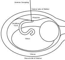 Percutaneous umbilical cord blood sampling (PUBS), also called cordocentesis, fetal blood sampling, or umbilical vein sampling is a diagnostic genetic test that examines blood from the fetal umbilical cord to detect fetal abnormalities.[1] Fetal and maternal blood supply are typically connected in utero with one vein and two arteries to the fetus. The umbilical vein is responsible for delivering oxygen rich blood to the fetus from the mother; the umbilical arteries are responsible for removing oxygen poor blood from the fetus. This allows for the fetus’ tissues to properly perfuse. PUBS provides a means of rapid chromosome analysis and is useful when information cannot be obtained through amniocentesis, chorionic villus sampling, or ultrasound (or if the results of these tests were inconclusive); this test carries a significant risk of complication and is typically reserved for pregnancies determined to be at high risk for genetic defect.[2] It has been used with mothers with immune thrombocytopenic purpura.[3]