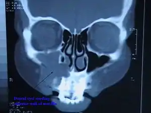 Commonly known as a dental cyst, the periapical cyst is the most common odontogenic cyst. It may develop rapidly from a periapical granuloma, as a consequence of untreated chronic periapical periodontitis.[1]