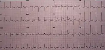 | An ECG showing pericarditis. Note the ST elevation in multiple leads with slight reciprocal ST depression in aVR. | |