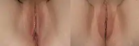 ![]() Perineoplasty: the pre-operative aspect (left), and the post-operative aspect (right) of the surgical correction of the perineum. | |