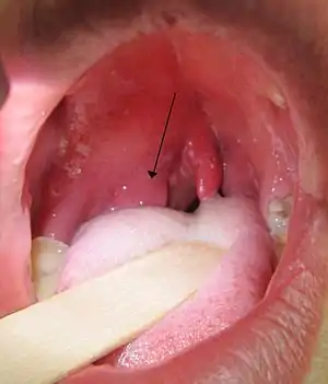 Peritonsillar abscess (PTA), also known as quinsy, is an accumulation of pus due to an infection behind the tonsil.[2] Symptoms include fever, throat pain, trouble opening the mouth, and a change to the voice.[1] Pain is usually worse on one side.[1] Complications may include blockage of the airway or aspiration pneumonitis.[1]
