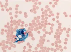 Perls Prussian blue is a commonly used method in histology, histopathology, and clinical pathology to detect the presence of iron in tissue or cell samples.[1][2][3][4] Perls Prussian Blue derives its name from the German pathologist Max Perls (1843–1881), who described the technique in 1867.[2] The method does not involve the application of a dye, but rather causes the pigment Prussian blue to form directly within the tissue.[5] The method stains mostly iron in the ferric state which includes ferritin and hemosiderin, rather than iron in the ferrous state.[6]