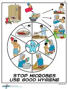 Laundry hygiene involves practices that prevent disease and its spread via soiled clothing and household linens such as towels.[15] Items most likely to be contaminated with pathogens are those that come into direct contact with the body, e.g., underwear, personal towels, facecloths, nappies. Cloths or other fabric items used during food preparation, or for cleaning the toilet or cleaning up material such as feces or vomit are a particular risk.[16]