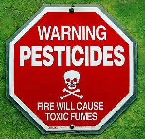 | A sign warning about potential pesticide exposure. | |