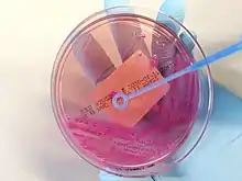 A Petri dish (alternatively known as a Petri plate or cell-culture dish) is a shallow transparent lidded dish that biologists use to hold growth medium in which cells can be cultured,[1][2] originally, cells of bacteria, fungi and small mosses.[3] The container is named after its inventor, German bacteriologist Julius Richard Petri.[4][5][6] It is the most common type of culture plate. The Petri dish is one of the most common items in biology laboratories and has entered popular culture. The term is often written in lower case, especially in non-technical literature.[7][8]