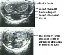 Peyronie's disease is a connective tissue disorder involving the growth of fibrous plaques in the soft tissue of the penis. Specifically, scar tissue forms in the tunica albuginea, the thick sheath of tissue surrounding the corpora cavernosa, causing pain, abnormal curvature, erectile dysfunction, indentation, loss of girth and shortening.[2][3]