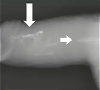 Projectional radiography ("X-ray"), penetrating the soft parts of the penis, showing radiopaque images that correspond to calcifications in the corpora cavernosa (arrows).