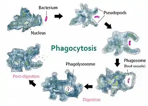 Ancient single-celled organisms such as amoeba use phagocytosis as a way to acquire nutrients, rather than an immune strategy. They engulf other smaller microbes and digest them within the phagosome of around one bacterium per minute, which is much faster than professional phagocytes.[23] For the soil amoeba Dictyostelium discoideum, their main food source is the bacteria Legionella pneumophila, which causes Legionnaire's disease in humans.[24] Phagosome maturation in amoeba is very similar to that in macrophages, so they are used as a model organism to study the process.[15]