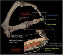 4. "Apical Phalangeal Tufts". Center for Academic Research & Training in Anthropogeny. Retrieved January 28, 2017. The tufts support the fleshy volar pad (also known as the distal pulp) on the palmar (volar) surface of the finger, as well as the nail on the dorsal surface.