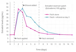 A study compared different particle sizes of oral micronized estradiol.[37][56] A preparation with the smallest particles (mainly <0.6 μm) was found to have the most rapid absorption and the highest bioavailability.[37][56] However, a sharp peak in estradiol levels, without an accompanying rise in estrone levels, was observed during the first 2 hours with this particle size.[37][56] It was suggested that the smallest estradiol particles may have been absorbed by the lymphatic system, partially bypassing first-pass metabolism and resulting in very high initial estradiol levels.[37] The preparations with the larger particle sizes (mainly <3.5 μm and <20 μm) were found to be absorbed more slowly, without a pronounced initial peak in estradiol levels.[37][56] Levels of estradiol were more even and similar to physiological levels with these particle sizes.[37][56] Differences in area-under-the-curve estradiol levels with the different particle sizes were relatively small.[37] As such, micronization may improve absorption but does not necessarily improve therapeutic effect.[56]