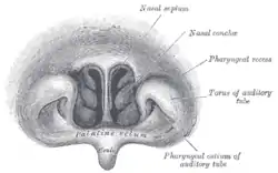 ![]() Front of nasal part of pharynx, as seen with the laryngoscope. (Pharyngeal recess labeled at center right.) | |