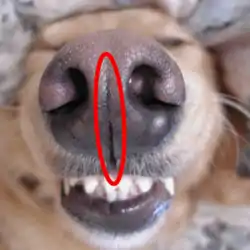 In most mammals, the philtrum is a narrow groove that may carry dissolved odorants from the rhinarium or nose pad to the vomeronasal organ via ducts inside the mouth.[4]
