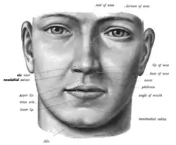 The philtrum (Latin: philtrum from Ancient Greek φίλτρον phíltron, lit. "love charm"[2]), or medial cleft, is a vertical indentation in the middle area of the upper lip, common to many mammals, extending in humans from the nasal septum to the tubercle of the upper lip. Together with a glandular rhinarium and slit-like nostrils, it is believed to constitute the primitive condition for at least therian mammals. Monotremes lack a philtrum, though this could be due to the specialised, beak-like jaws in living species.[3]