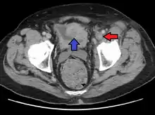 Phlegmasia cerulea dolens (PCD) [literally: painful blue inflammation; not to be confused with preceding phlegmasia alba dolens] is an uncommon severe form of lower extremity deep venous thrombosis (DVT) that obstructs blood outflow from a vein. Upper extremity PCD is less common, occurring in under 10% of all cases.[1] PCD results from extensive thrombotic occlusion (blockage by a thrombus) of extremity vein(s), most commonly an "iliofemoral" DVT of the iliac vein and/or common femoral vein.[2][3] It is a medical emergency requiring immediate evaluation and treatment.